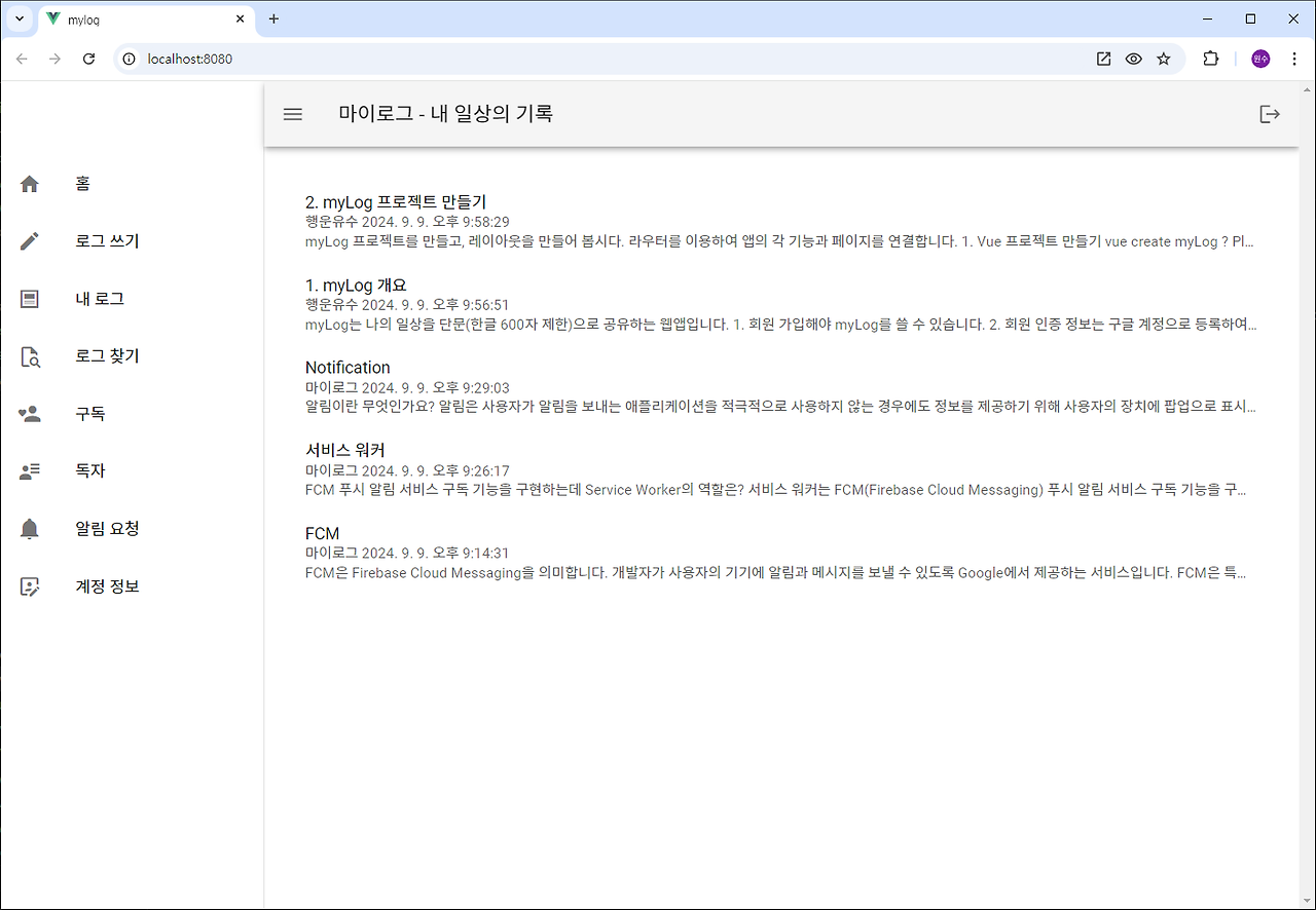 MyLogView 마이로그 상세보기 페이지가 열릴 때 매개변수로 받은 mylogId로 firestore에서 마이로그를 가져옵니다. 그런데 굳이 firestore에서 마이로그를 가져와야 할까요? 마이로그에 접속할 때 모든 마이로그를 메모리에 로드하여 가지고 있으므로 이것에서 가져올 수도 있습니다. 그럼에도 여기서는 firestore에서 가져오도록 합니다. 마이로그에 html이 포함되어 있으므로 sanitizeContent()로 안전한 html로 변경한 후 화면에 나타냅니다.