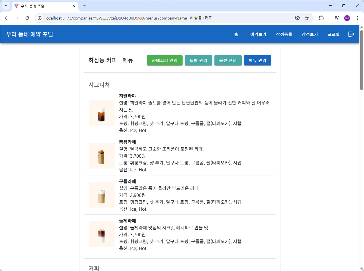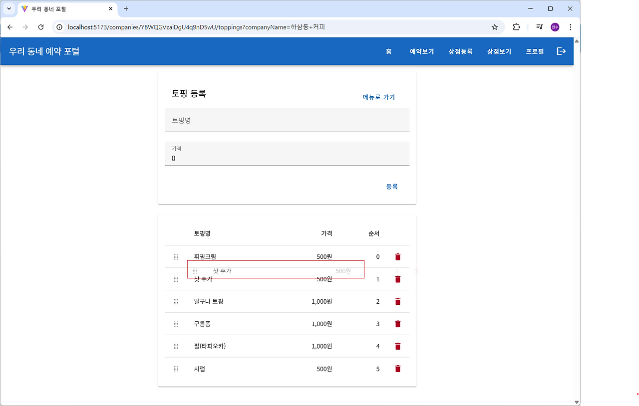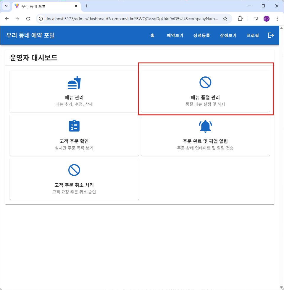 카페 메뉴 품절 관리메뉴가 품절인 경우에 대한 처리를 생각해 봅시다. 품절이 확인 되면 관리자가 우선 메뉴의 품절 상태를 설정합니다.그러면 온라인 주문 메뉴 리스트에 품절을 표시해야 합니다.품절된 품목에 대해서는 주문이 되지 않습니다. https://github.com/inetsos/downtown GitHub - inetsos/downtown: 동네 포털 - Vue 3 + Firebase동네 포털 - Vue 3 + Firebase. Contribute to inetsos/downtown development by creating an account on GitHub.github.com 운영 대시보드- src/views/OperationsDashboard.vue 운영자 대시보드 ..