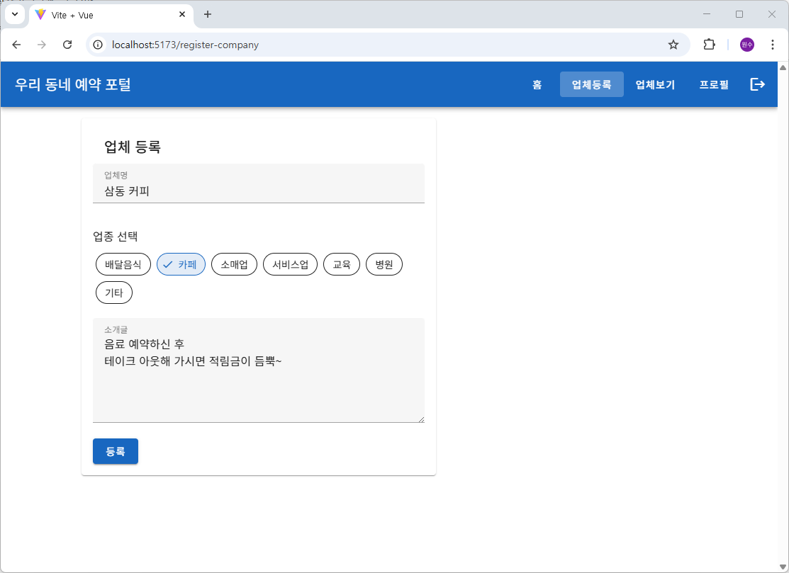 Firebase Hosting으로 실제 웹 서비스 오픈까지 진행합니다.서비스 오픈까지 개발을 진행하면서 계속 수정, 변경될 것입니다.등록 업체 보기(홈)홈페이지에 등록한 모든 업체들을 보여 줍니다.업종을 선택하면 해당 업종의 업체들만 볼 수 있습니다. 업체 리스트에서 업체를 클릭하면 업체 정보 상세 보기로 이동합니다. 로그인 한 상태라면 ‘예약 하기’ 버튼을 볼 수 있고,예약 하기를 누르면 예약 화면으로 이동합니다. src/stores/companyStore.js🔹 업체 목록 : fetchAllCompanies// src/stores/companyStore.jsimport { defineStore } from 'pinia'import { ref } from 'vue'import { db } from..