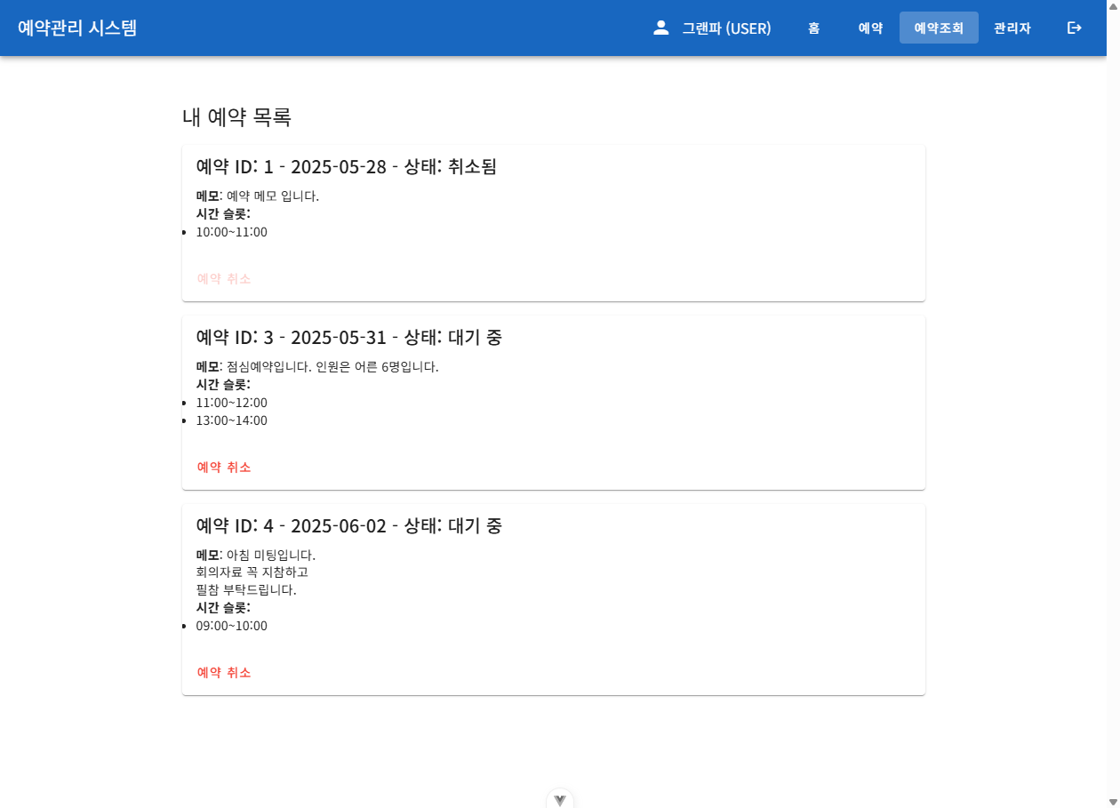 회원 예약 조회 및 취소회원은 자신의 예약을 조회할 수 있습니다.자신의 예약을 취소할 수 있습니다. ‘예약조회’를 누르면, 예약 조회 페이지로 이동하고, 자신의 모든 예약을 볼 수 있습니다.각 예약에는 ‘예약 취소’ 버튼이 있어 이것을 누르면 예약이 취소 됩니다. - 프론트엔드 -UserReservations.vue 내 예약 목록 예약 ID: {{ reservation.id }} - {{ reservation.date }} - 상태: {{ statusText(reservation.status) }} 메모: {{ reservation.memo }} 시간 슬롯: {{ slot...